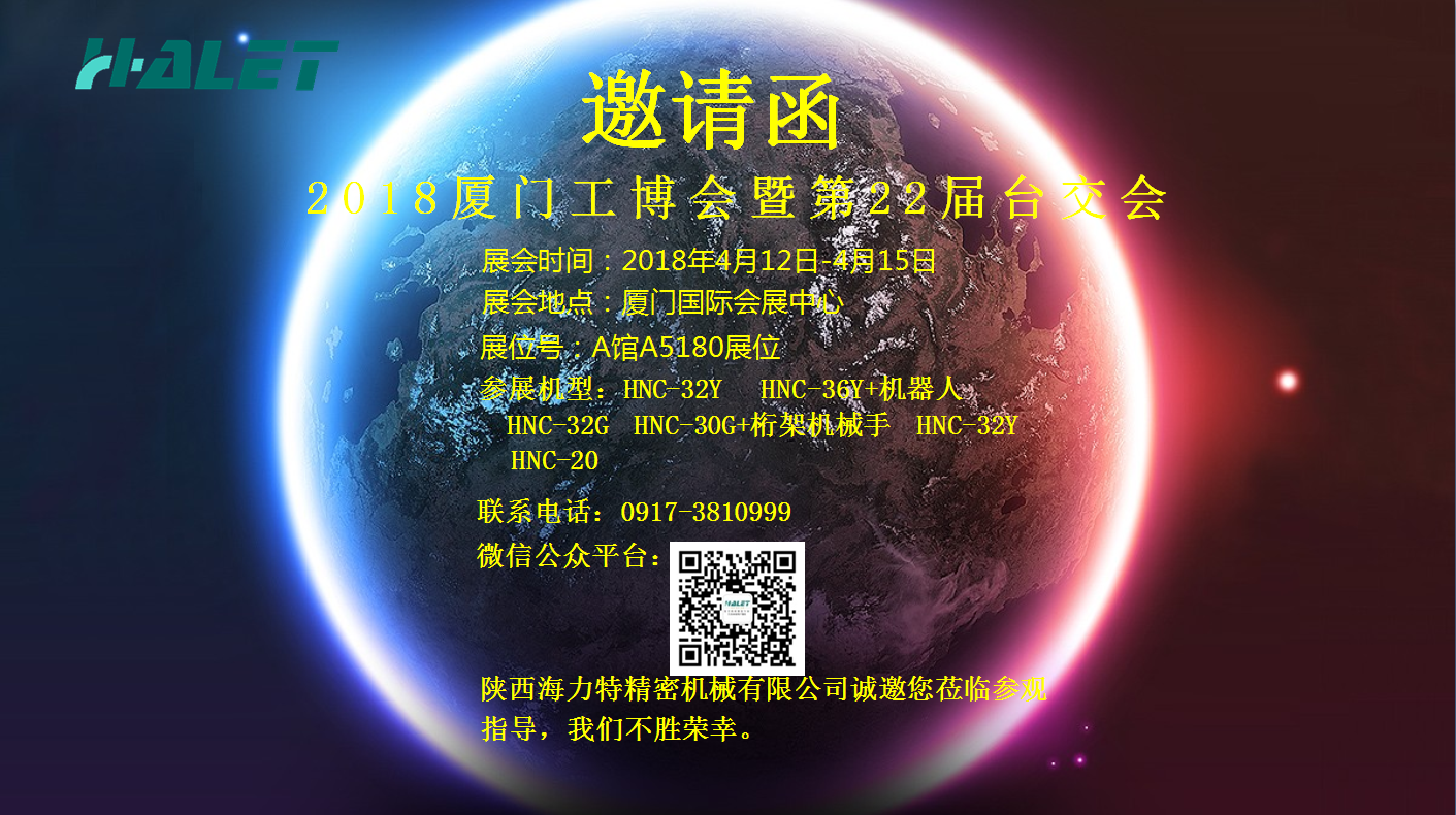 2018廈門工博會暨第二十二屆臺交會4月12日——4月15日將在廈門國際會展中心隆重召開。此次展會陜西海力特精密機械有限公司將攜HNC-32Y,HNC-36Y精密車銑復合機床,HNC-32G,HNC-20,HNC-30G精密排刀車床,HNC-500Z桁架機械手參加此次盛會。海力特公司誠邀各界新老朋友蒞臨展位參觀指導,洽談合作,共創美好未來。